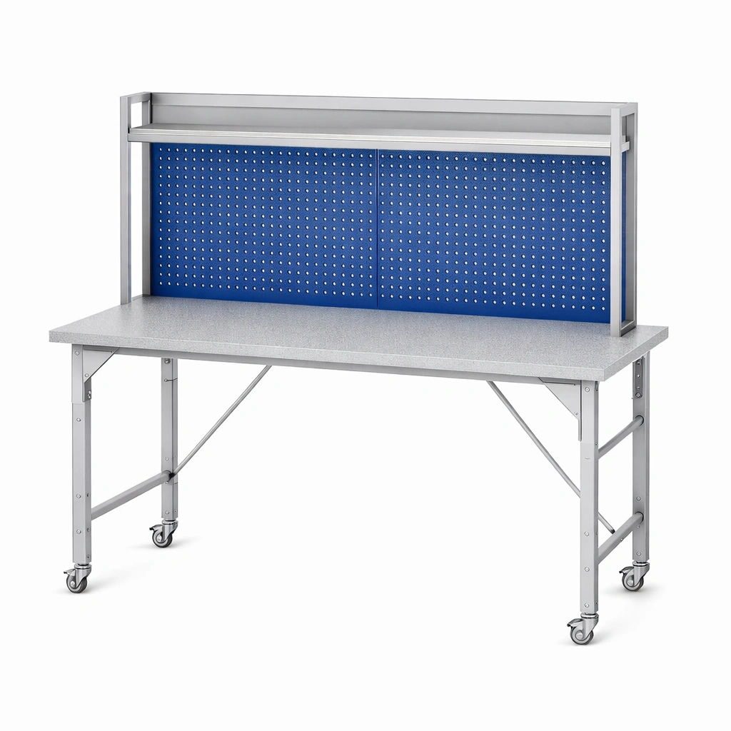 Esta mesa de trabajo está fabricada con estructura de metal y una superficie de estratificado resistente. Incluye un panel perforado de metal pintado en azul para almacenamiento de herramientas. Dimensiones: longitud 183 cm, ancho 76 cm, altura 152 cm. Tiene ruedas bloqueables para facilitar su desplazamiento. Capacidad de carga máxima: 150 kg. Peso total: 45 kg.